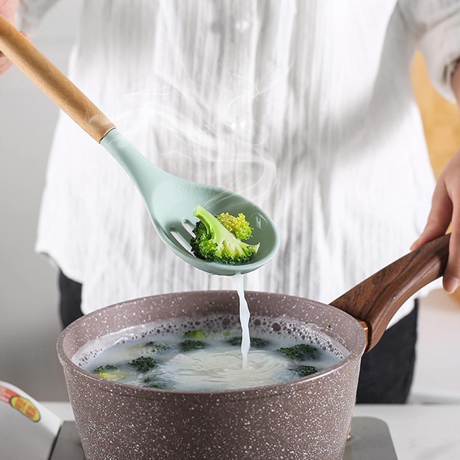 - ERGONOMIC WOODEN HANDLE & COMFORTABLE GRIP: Each utensil features a natural, sturdy Wooden Handle that stays cool to the touch and provides an exceptional, comfortable grip.1 The combination of Green Silicone and wood offers superior control and a beautiful aesthetic for your kitchen décor.