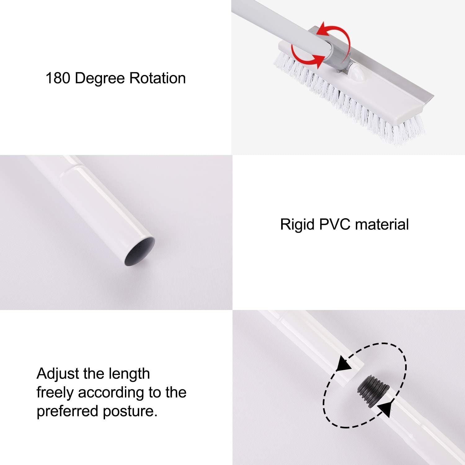- 【Sturdy, Durable & Easy to Maintain】The floor scrub brush is made of high-quality PVC bristle, rubber squeegee, and stainless steel handle. You can use the floor brush for years, window cleaner no bent or deformed. There is a hanging hole on the top of the handle, the scrub brushes can be stored on the bathroom wall. Space-saving design and handy to use for next time