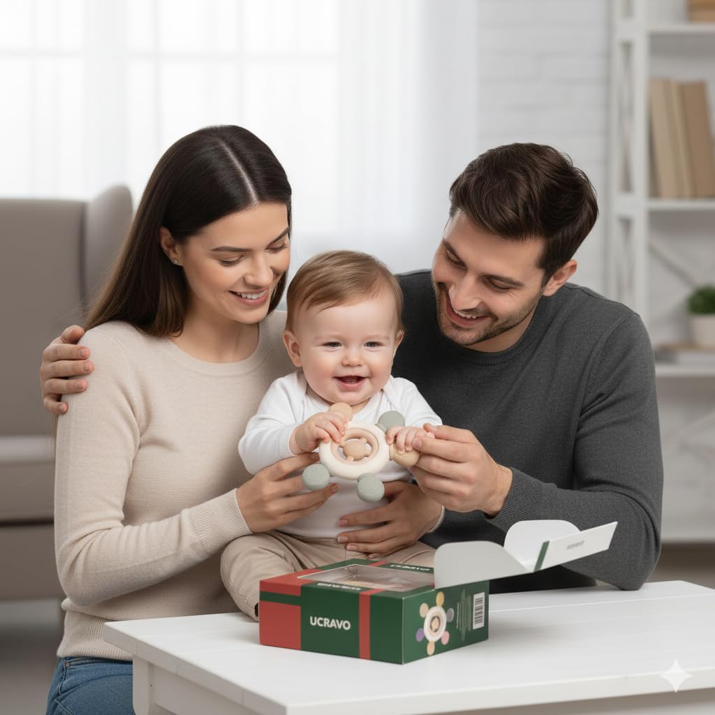 UCRAVO 2-in-1 Baby Teether Toy | Natural Neem Wood & Food-Grade Silicone Sensory Toy for Infants 3+ Months | BPA-Free Soft Teething Ring for Gum Relief | Safe Non-Toxic Antimicrobial Wood Baby Teether