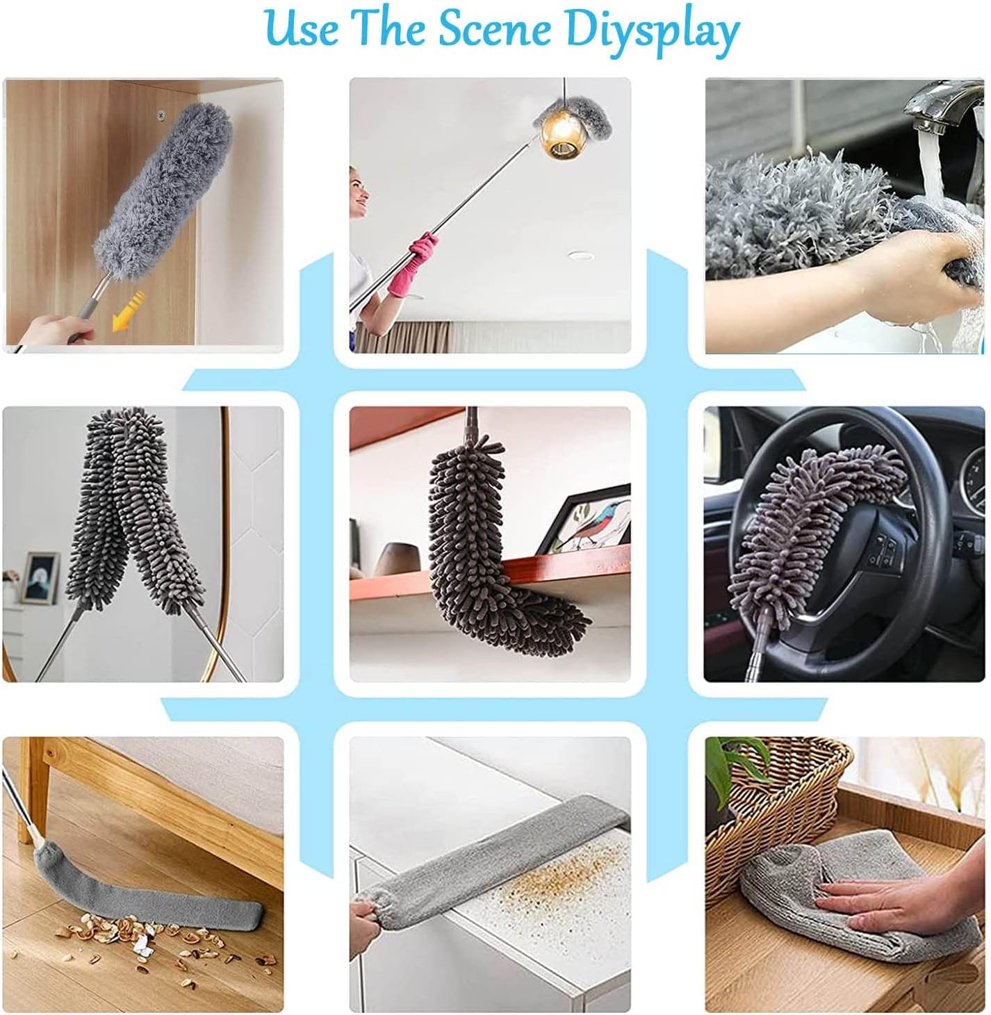 - 🌀 Flexible, Bendable & Rotatable Design for 360° Cleaning – Each microfiber duster head is bendable and flexible to reach tricky areas. Clean window grills, fans, blinds, lights, wall corners, behind furniture, and under appliances effortlessly. The 360° rotation ensures dust removal from every angle.