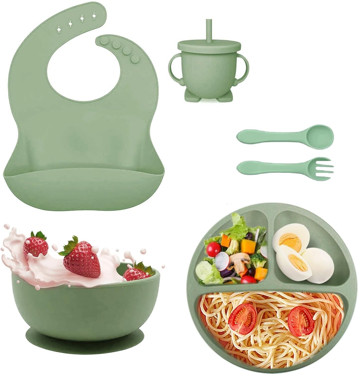 - 💚 Fresh Green Baby Weaning Kit (6 PCS) – Includes suction bowl, divided plate, silicone bib with pocket, toddler training cup with straw, spoon, and fork. A complete baby mealtime set for infants and toddlers.