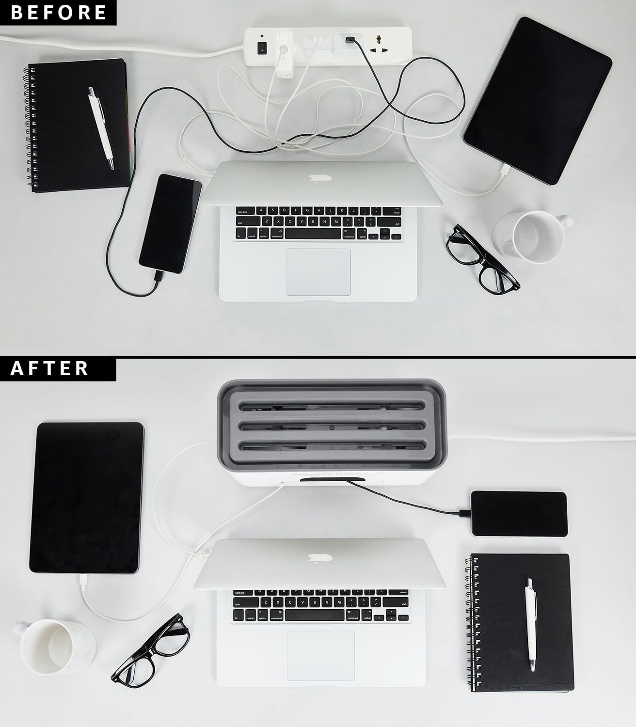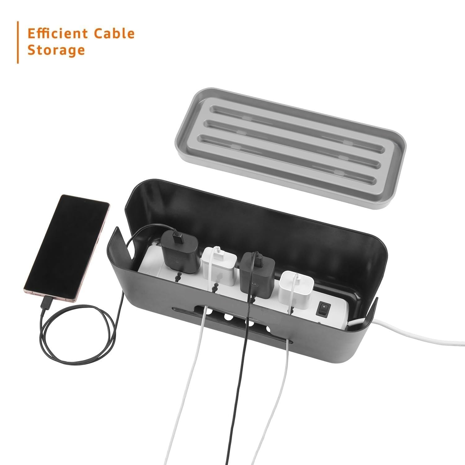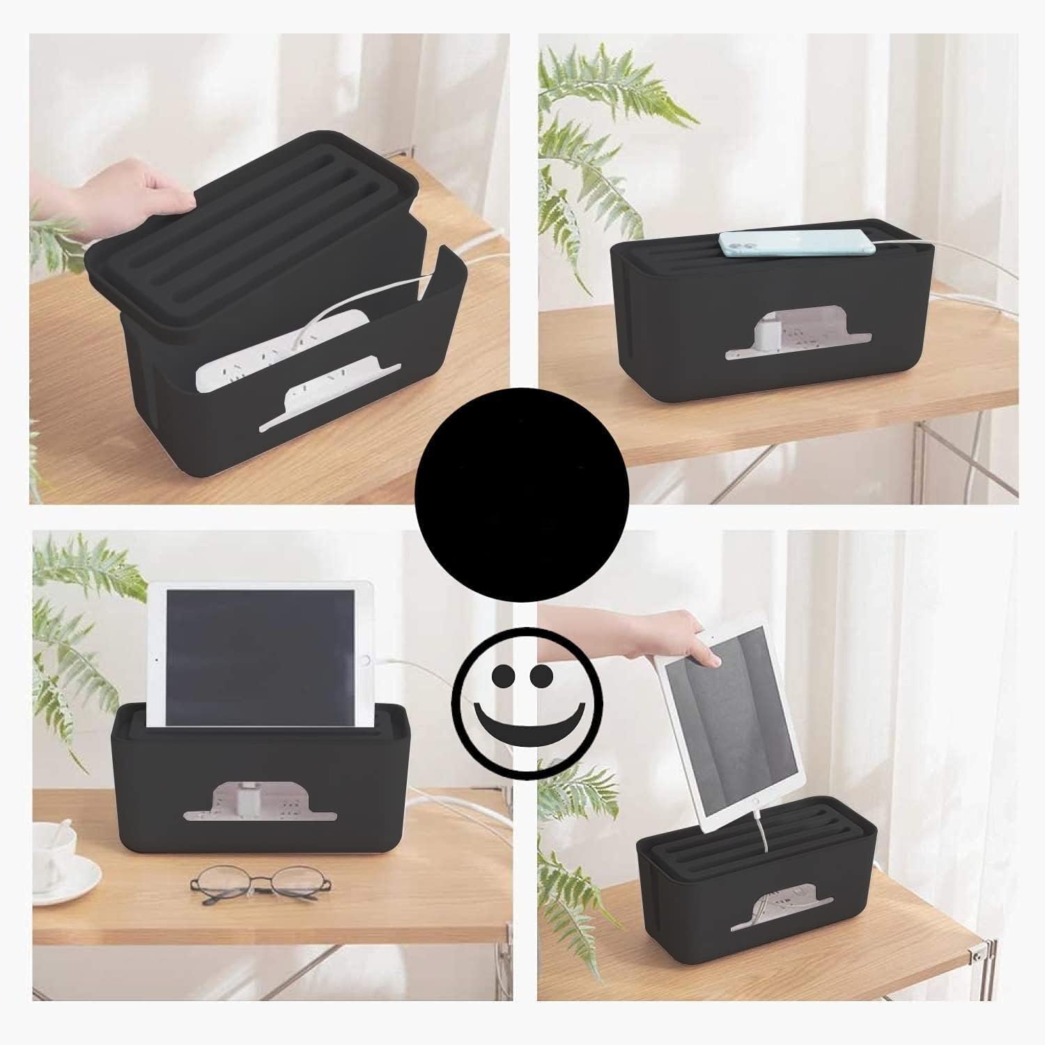 - Space Saving Heads Up Top Slots: This Cable Management box comes with slots on the lid with holes to take out your cables and charging wires. Not only does this design provide slots for storing items on top of the box (like pens, clips, devices) but also acts like a stand and allows you to charge your phone or tablet while it is visible to you so you can see notifications, alarms, movies, videos, video calls and much more while the device charges!