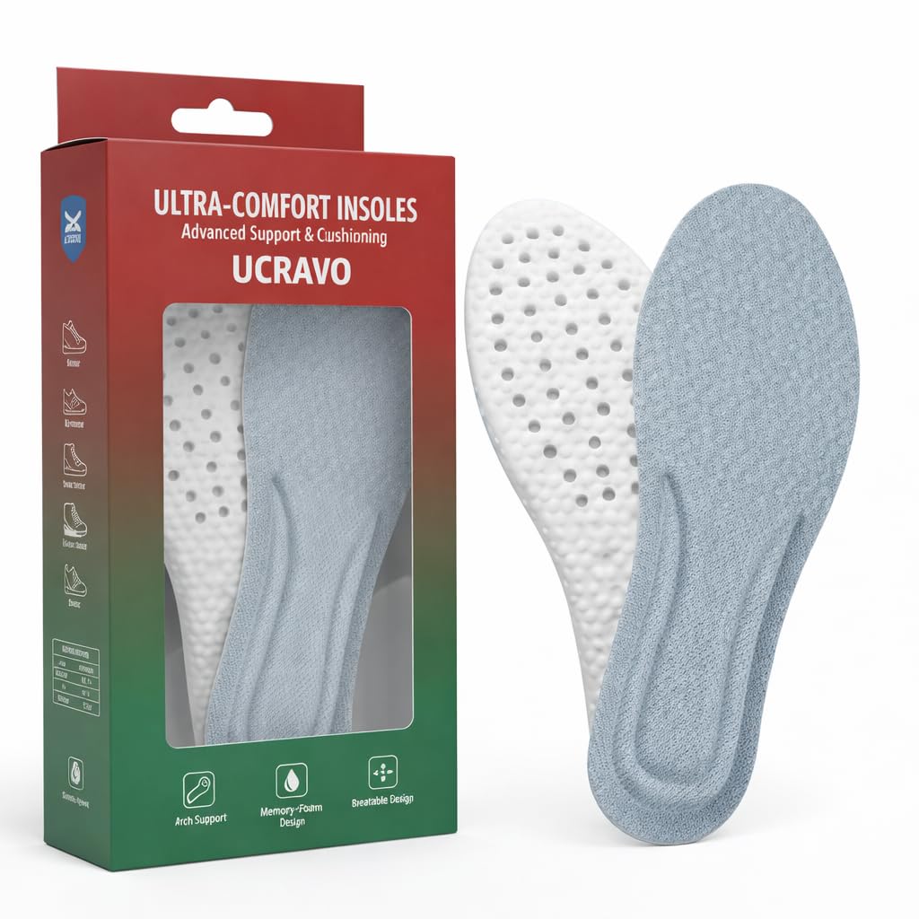 UCRAVO Memory Foam Shoe Insoles for Men & Women Soft Cushion Shock Absorbing Height Increasing Sports Breathable Orthopedic Arch Support Inserts Cuttable Comfort Pads for Running,Walking, Daily Shoes