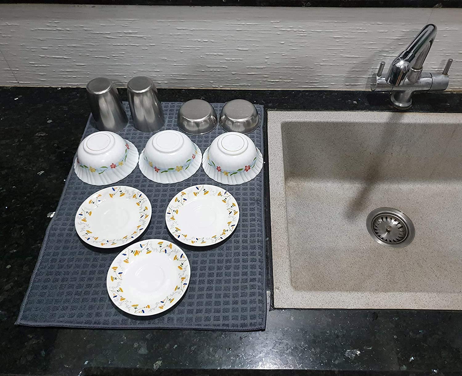- PROTECT DELICATE STEMWARE : This plush microfiber dish drying mat acts as a cushion to protect delicate dishes and stemware from damage while also protecting your kitchen surfaces from wear and tear.