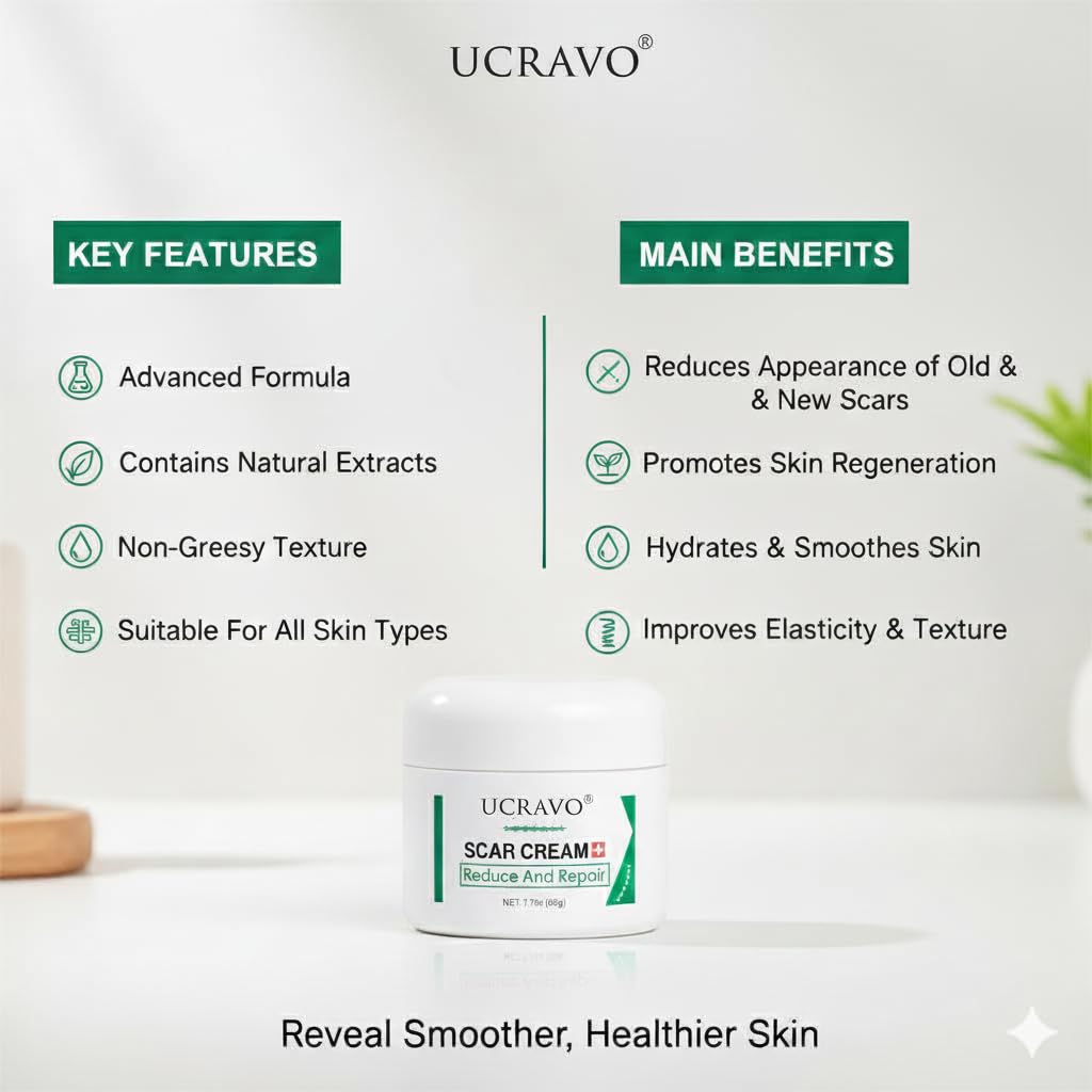 - ✅ ADVANCED SCAR REMOVAL & SKIN REPAIR BY UCRAVO:-UCRAVO Scar Cream is a powerful scar reduction and skin repair treatment designed to help visibly reduce the appearance of old scars, new scars, acne scars, pimple marks, surgical scars, burn scars, cut marks, injury scars, wound scars, stretch marks, C-section scars, and pigmentation marks, while improving overall skin texture, tone, and smoothness with consistent daily use.
