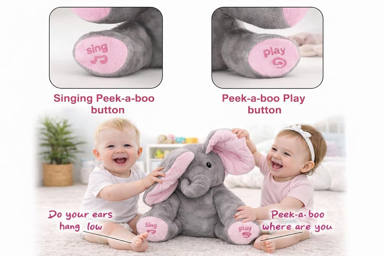 - 🐘Interactive Singing Elephant Plush Toy for Baby Fun & Learning:-Bring joy and laughter with the UCRAVO musical elephant plush, designed with interactive singing and playful peek-a-boo actions. This adorable stuffed elephant entertains babies and toddlers while encouraging early sensory development, listening skills, and interactive playtime.