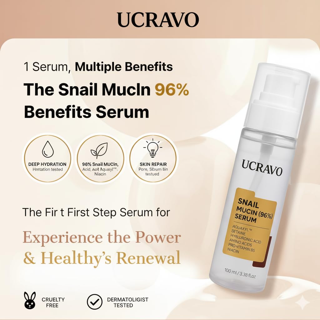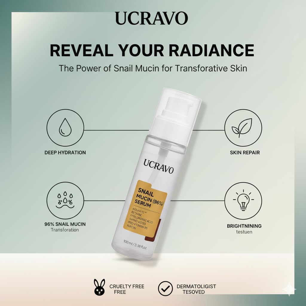 UCRAVO Snail Mucin Repairing Serum 100ml, Hydrating Serum for Face with Snail Secretion Filtrate for Dull Skin & Fine Lines, Korean Skin Care