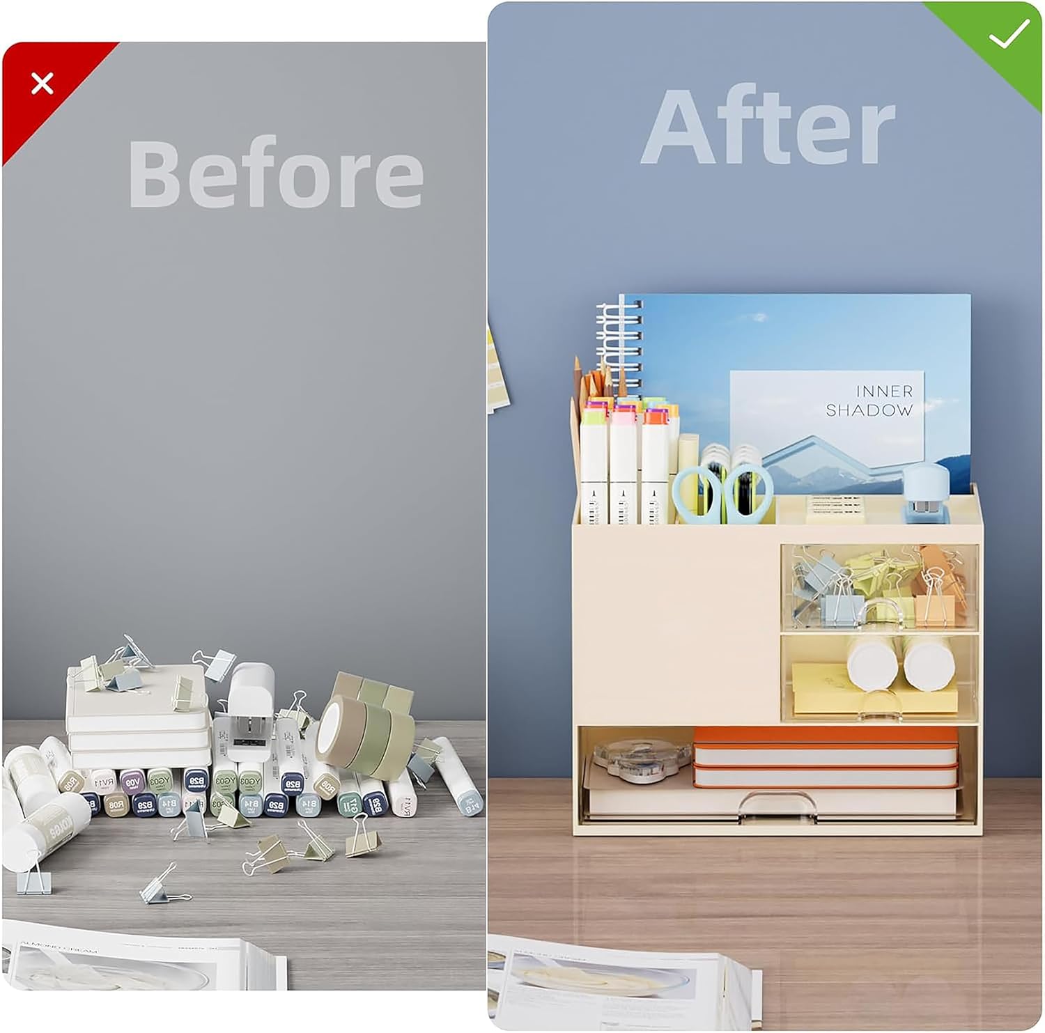 - ⏰ SAVE TIME WITH SEAMLESS ACCESS: Stop wasting precious minutes searching for lost pens or highlighters! The vertical design and transparent drawers ensure everything is visible and within arm's reach. This Multi-Functional system lets you quickly access small items like paper clips and flash drives, maximizing your efficiency and time management during exams or deadlines.